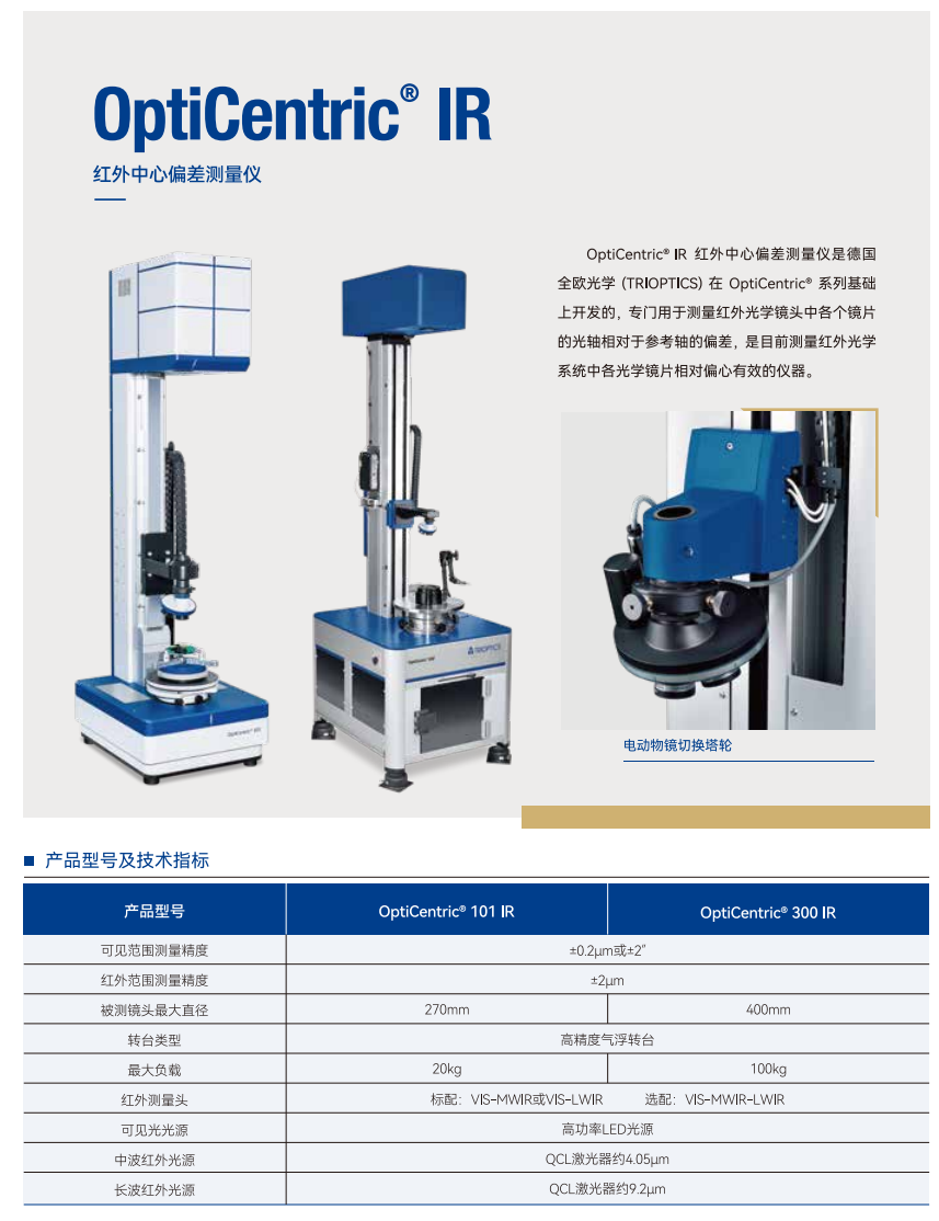 OptiCentric®IR 红外中心偏差测量仪是在OptiCentric系列基础上开发的,专门用于测量红外光学镜头中各个镜片的光轴相对于参考轴的偏差,是目前测量红外光学系统中各光学镜片相对偏心有效的仪器。