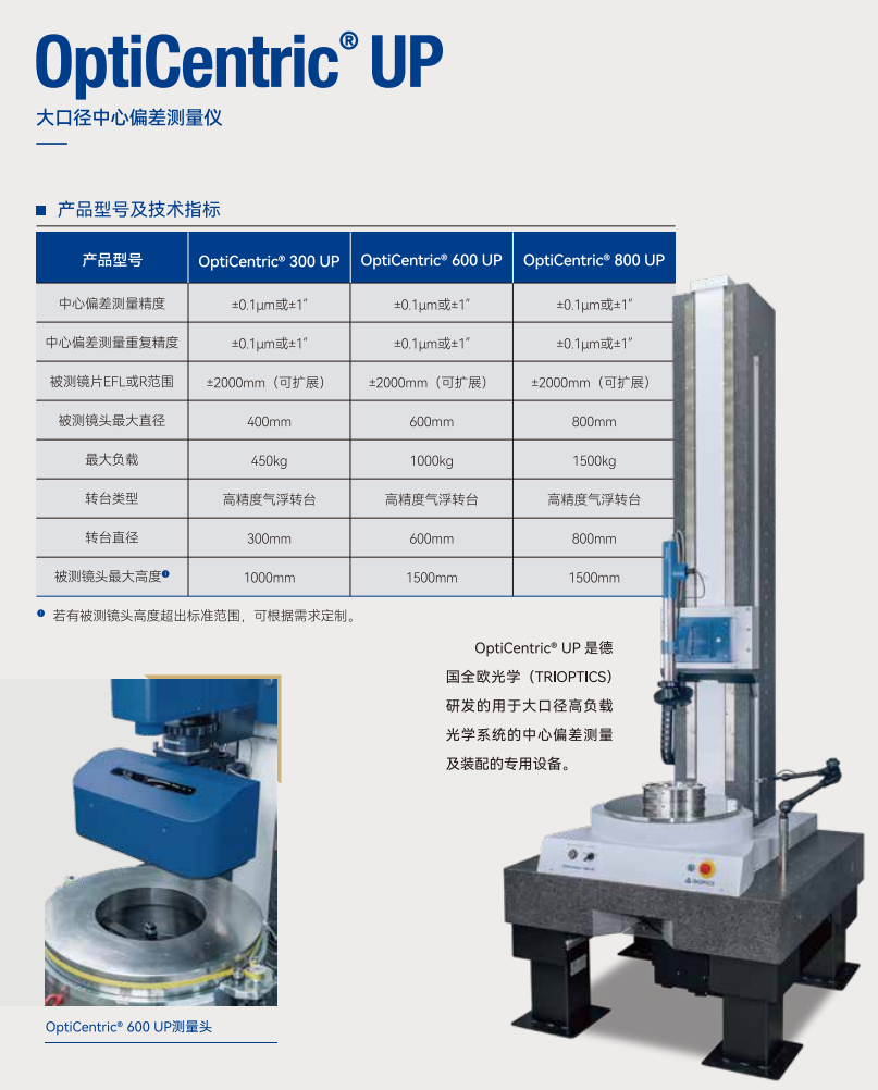 OptiCentricUP是德国全欧光学(TRIOPTICS)研发的用于大口径高负载光学系统的中心偏差测量及装配的专用设备。