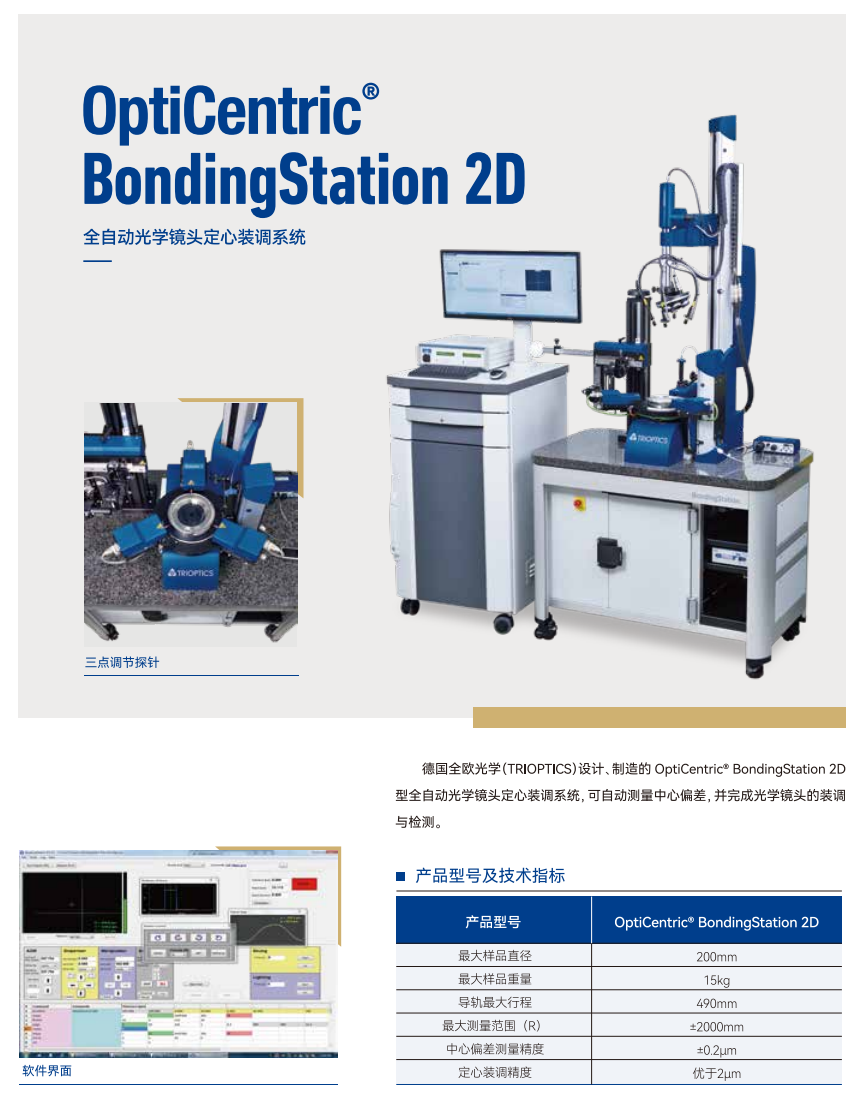 德国全欧光学(TRIOPTICS)设计、制造的OptiCentric® BondingStation 2D 全自动光学镜头定心调装系统,可自动测量中心偏差,并完成光学镜头的装调与检测。