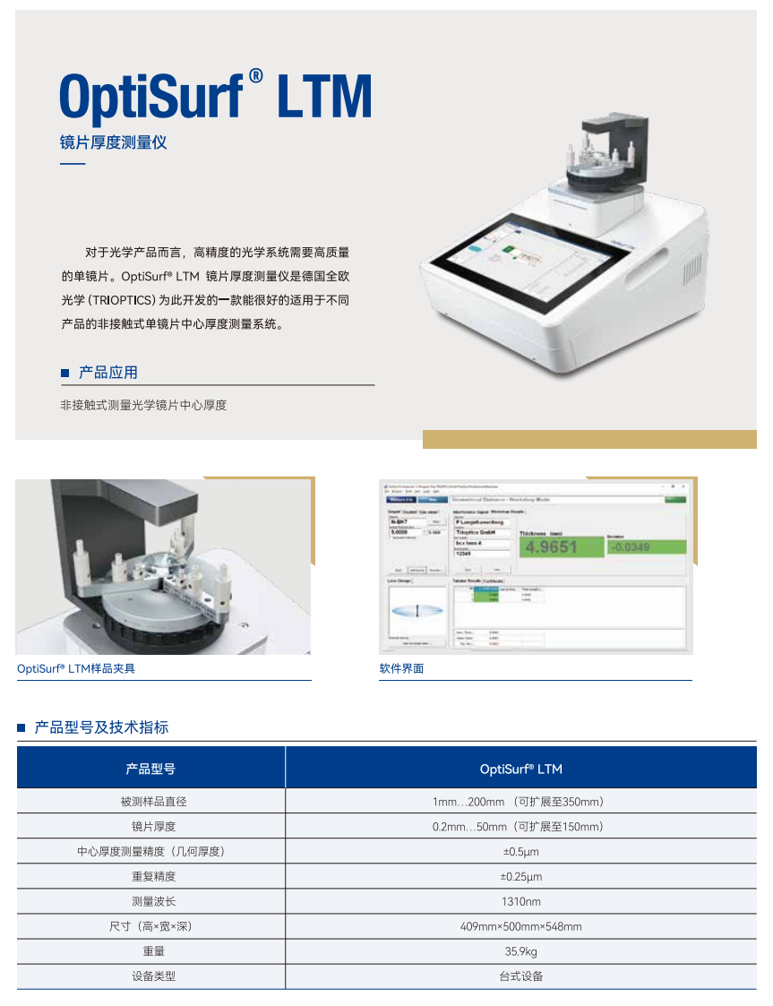对于光学产品而言,高精度的光学系统需要高质量的单镜片。OptiSurf® LTM 镜片厚度测量仪是德国全欧光学(TRIOPTICS)为此开发的一款能很好的适用于不同产品的非接触式单镜片中心厚度测量系统。