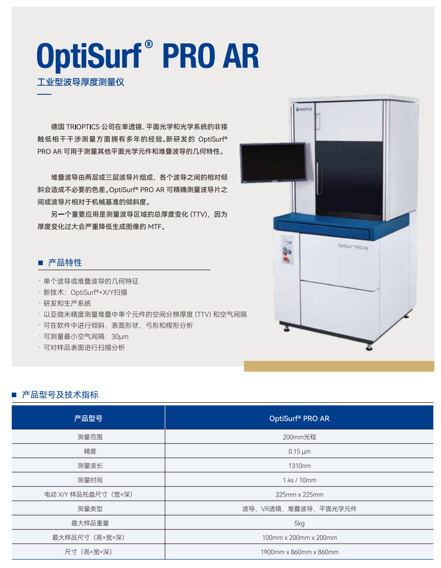 德国TRIOPTICS公司在单透镜、平面光学和光学系统的非接触低相干干涉测量方面拥有多年的经验。新研发的OptiSurf® PRO AR可用于测量其他平面光学元件和堆叠波导的几何特性。