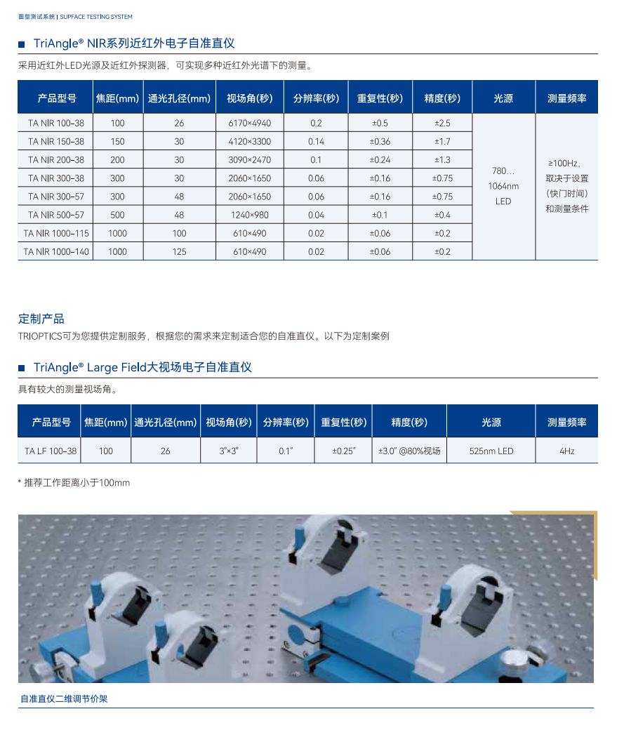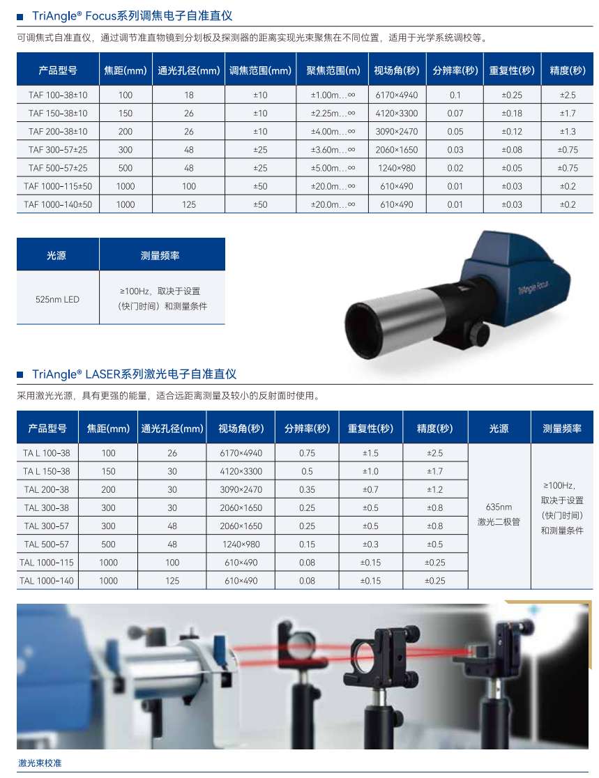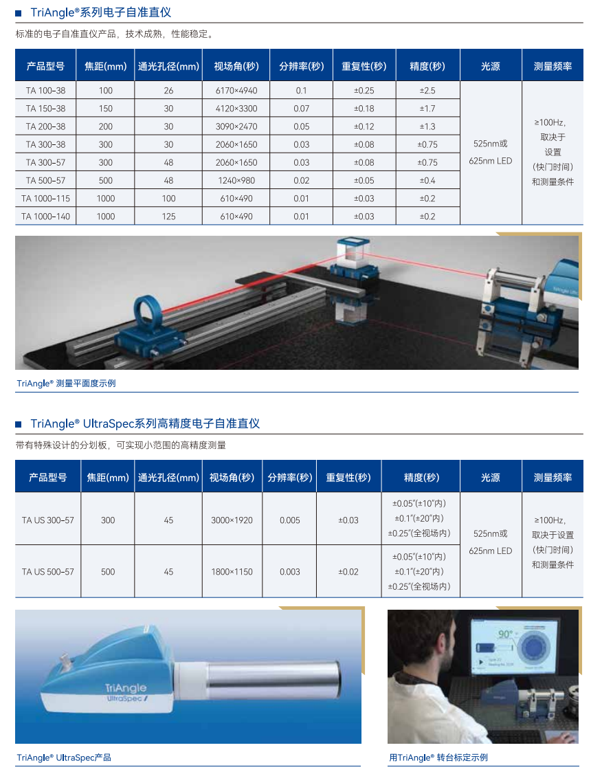 德国全欧光学(TRIOPTICS)设计、生产的TriAngle®系列电子自准直仪基于高分辨率的CMOS或PSD,结合不同焦距的准直物镜,使得整套仪器具有非常宽广的测量范围和多种测量精度来满足不同的测量需求。