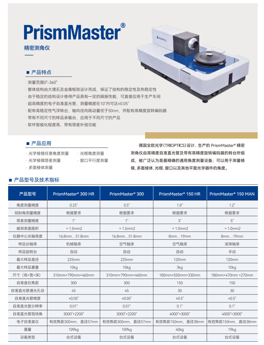 德国全欧光学(TRIOPTICS)设计、生产的PrismMaster精密测角仪由高精度自准直光管及带有高精度旋转编码器的转台所组成,被广泛认为是最精确的通用角度测量设备;可以用于测量棱镜、多面棱体、光楔、窗口以及其他平面光学器件的角度。