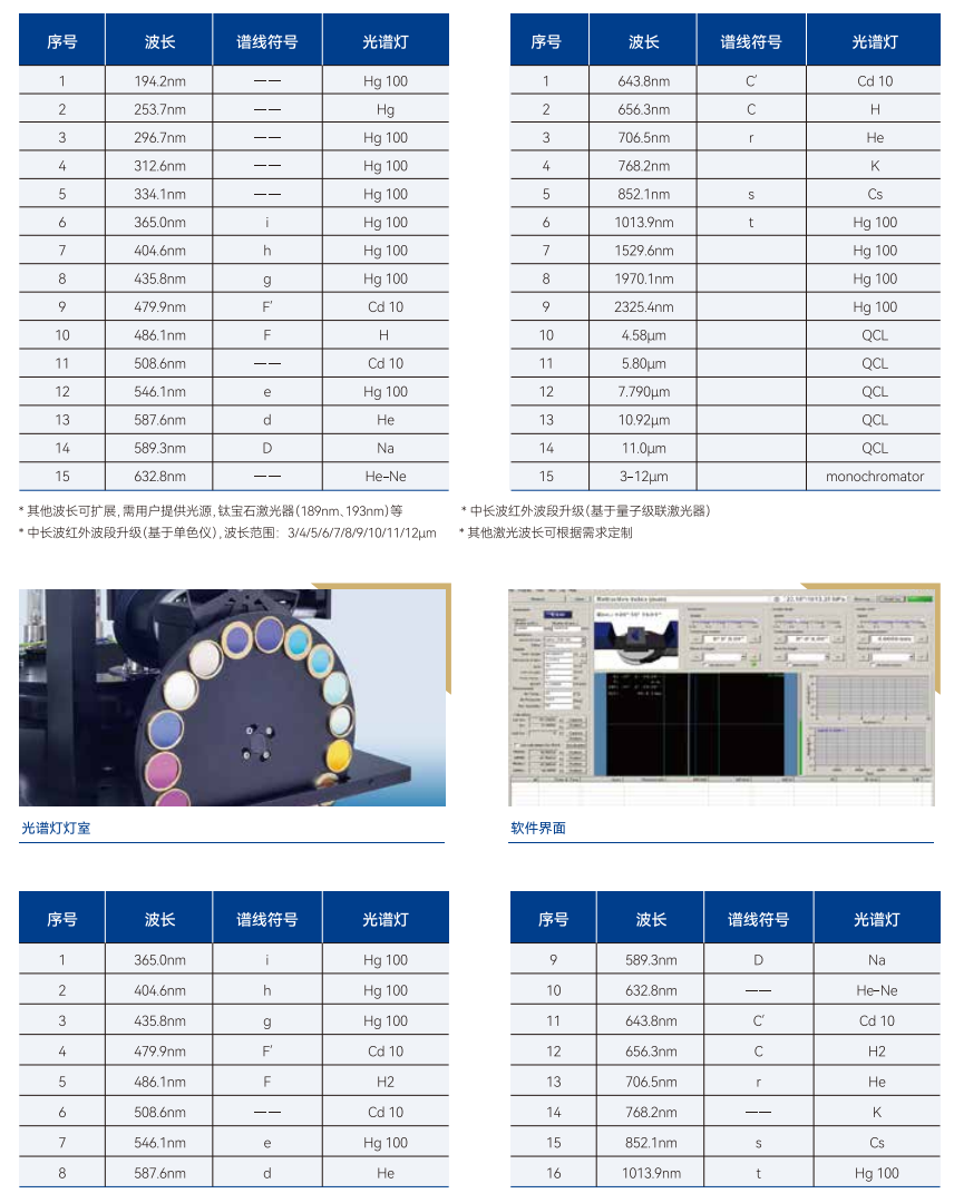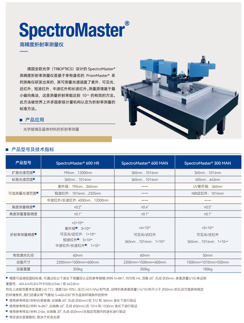 德国全欧光学(TRIOPTICS)设计的SpectroMastere高精度折射率测量仪可测量光谱涵盖了紫外、可见光、近红外、短波红外、中波红外和长波红外。测量原理基于最小偏向角法,此方法被世界上许多国家级计量机构认定为折射率测量的标准方法。