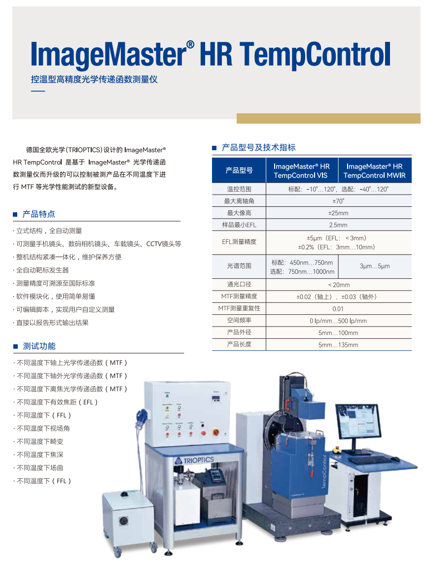 德国全欧光学(TRIOPTICS)设计的ImageMasterHR TempControl是基于ImageMaster光学传递函数测量仪而升级的可以控制被测产品在不同温度下进行MTF等光学性能测试的新型设备。