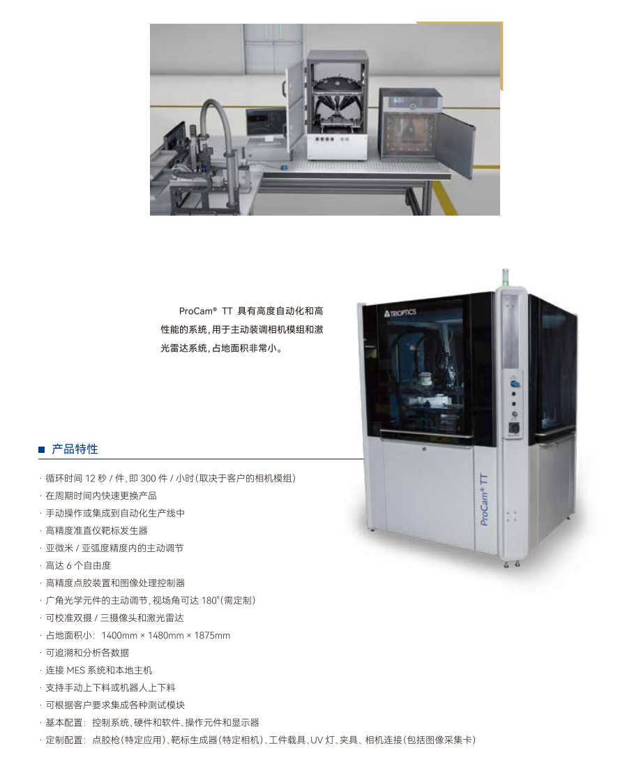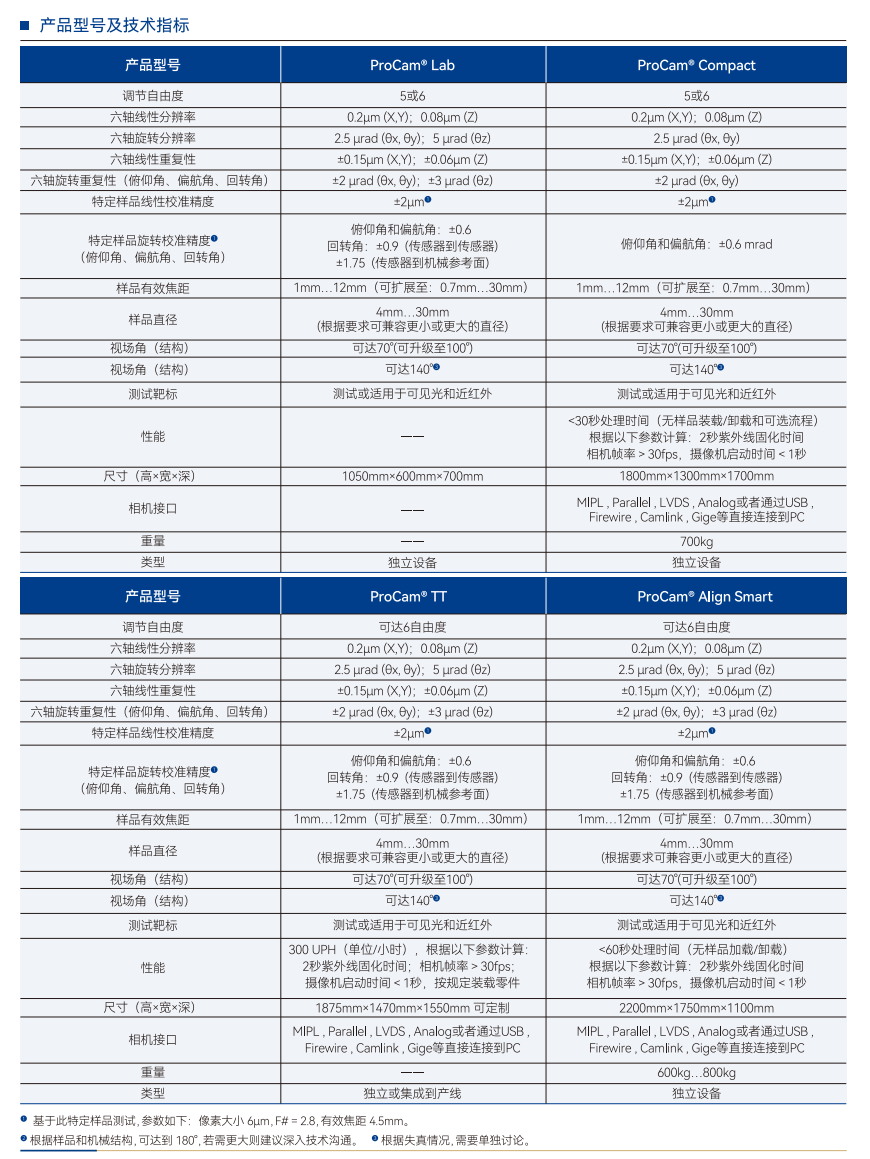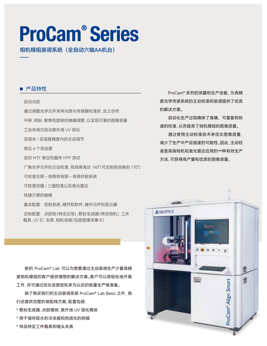 ProCam® Series系列的测量和生产设备,为高精度光学传感系统的主动校准和装调提供了优质的解决方案。自动化生产过程确保了准确、可重复和快速的校准,从而提高了相机模组的图像质量。