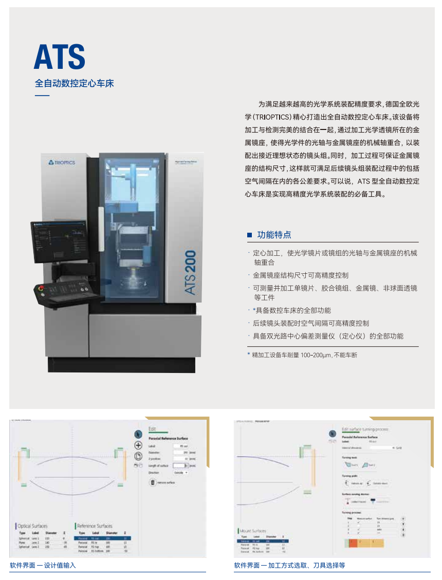德国全欧光学(TRIOPTICS)精心打造出全自动数控定心车床。该设备将加工与检测完美的结合在一起,通过加工光学透镜所在的金属镜座,使得光学件的光轴与金属镜座的机械轴重合,以装配出接近理想状态的镜头组。